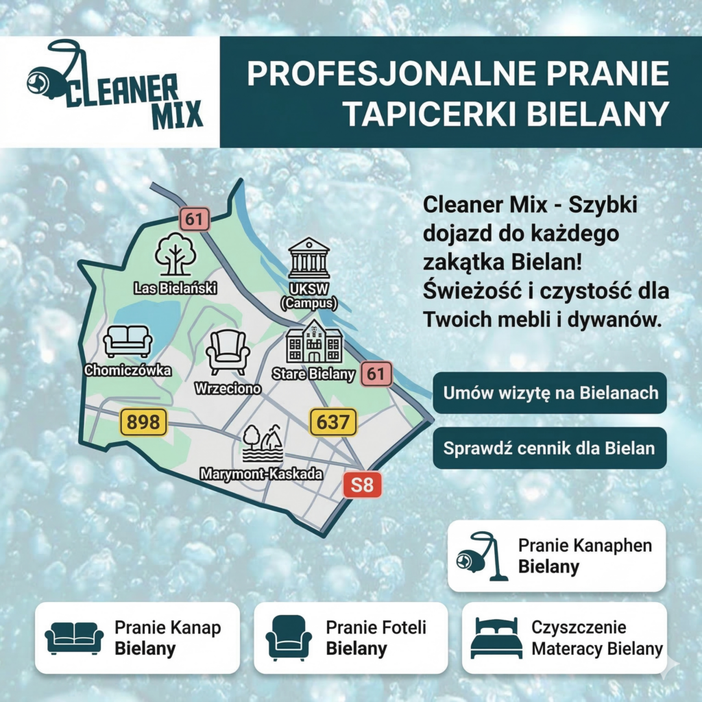 Szukasz profesjonalnego czyszczenia mebli blisko domu? Ekipa Cleaner Mix obsługuje każdy zakątek tej zielonej dzielnicy. Nasze furgonetki codziennie przemierzają główne arterie, takie jak ul. Marymoncka, ul. Żeromskiego czy ul. Kasprowicza, co pozwala nam oferować błyskawiczne terminy realizacji na całych Bielanach.