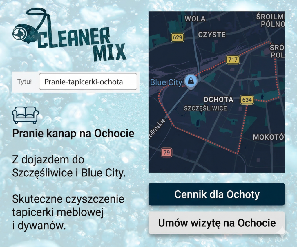 Szukasz sprawdzonej usługi prania tapicerki Ochota? Cleaner Mix to mobilna ekipa, która dociera bezpośrednio pod Twój adres – przy ul. Grójeckiej, na Rakowcu, Szczęśliwicach czy w okolicach Parku Szczęśliwickiego. Przywozimy profesjonalny sprzęt, certyfikowaną eko-chemię i wyjeżdżamy z czystą tapicerką – bez wywożenia mebli, bez ukrytych kosztów, 7 dni w tygodniu w godzinach 7:00–23:00.