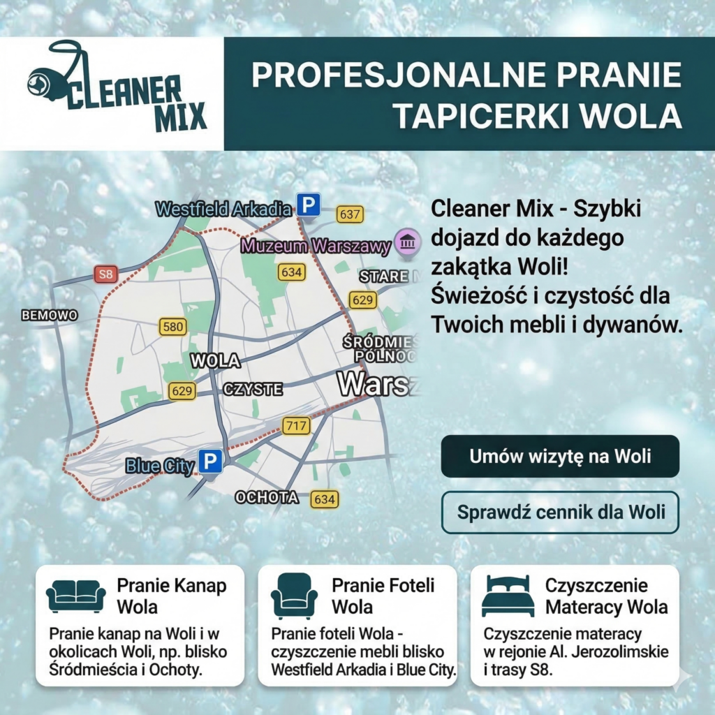 Nie czekaj, aż plamy staną się niemożliwe do usunięcia. Wybierz lokalnego eksperta, który zna specyfikę warszawskiej Woli i oferuje darmowy dojazd pod każdy adres. Cleaner Mix to gwarancja punktualności, rzetelności i najwyższych standardów czystości.